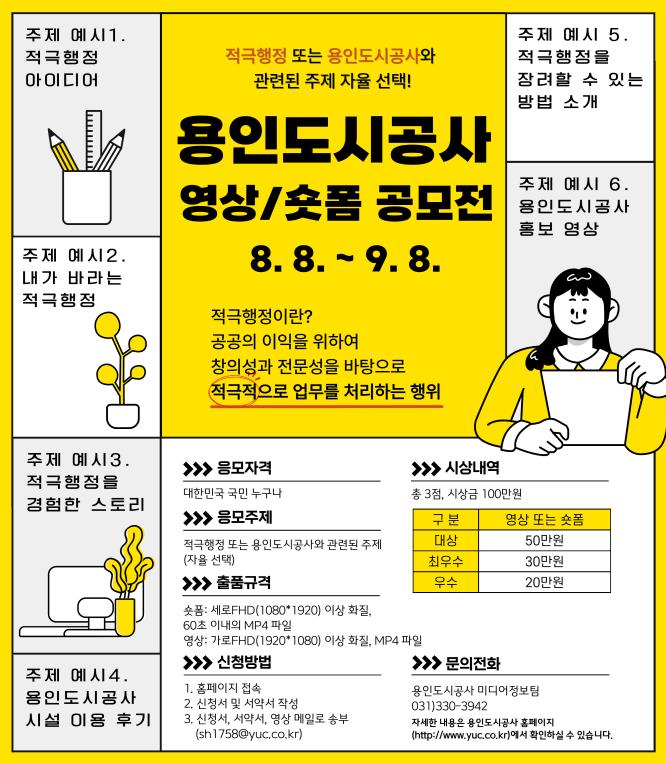 지역 제한 없이 대한민국 국민 누구나 참여할 수 있으며, 영상과 숏폼 구분 없이 출품 가능하다. 주제는 ‘적극행정’ 또는 ‘용인도시공사 관련 내용’ 중 자율적으로 선택할 수 있고 시상은 ▲대상 50만 원 ▲최우수상 30만 원 ▲우수상 20만 원으로 총상금 100만 원과 상장이 수여된다.