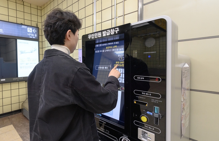 ▲ 양천구 신정역에 새로 설치된 무인민원발급기에서 제증명서를 발급 중인 구민