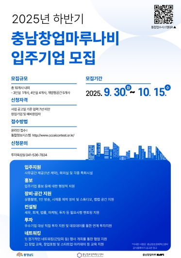 [뉴스스텝] (재)충남창조경제혁신센터는 오는 10월 15일까지 2025년 하반기 충남창업마루나비 입주기업을 모집한다고 밝혔다. 이번 모집은 혁신적인 아이디어와 성장 잠재력을 지닌 스타트업을 발굴해 안정적인 보육 환경을 제공하고, 기업의 지속적인 성장을 지원하기 위해 추진된다.