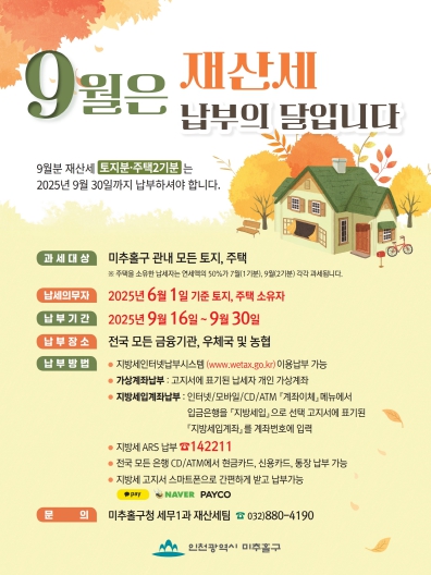 [뉴스스텝] 인천 미추홀구는 9월 정기분 재산세(토지분 및 주택 2기분) 518억 원, 21만 2천여 건을 부과했다고 16일 밝혔다.