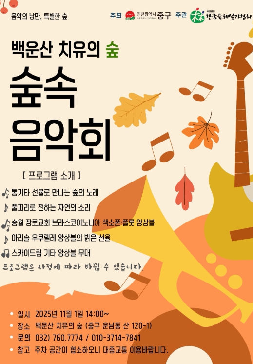 이번 음악회는 인천 중구가 ‘2025년 산림치유 프로그램 운영 사업’의 일환으로 올해 처음 선보이는 행사다.