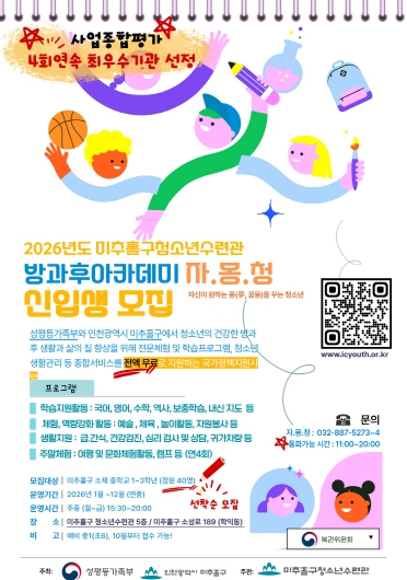 [뉴스스텝] 인천 미추홀구청소년수련관(관장 고석찬)이 운영하는 청소년방과후아카데미 ‘자·몽·청(자신이 원하는 꿈을 꾸는 청소년)’이 2026년도 신입생을 모집한다고 17일 밝혔다.