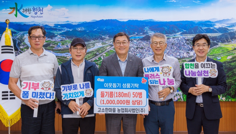 [뉴스스텝] 고소한마을 농업회사법인(대표 하성목)은 9월 22일 합천군청을 방문해 이웃돕기 성품으로 100만원 상당의 들기름 50병을 합천군에 기탁했다.