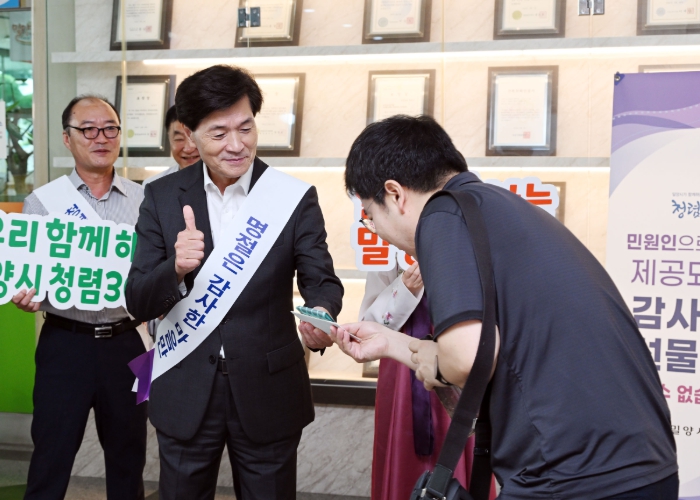 [뉴스스텝] 경남 밀양시는 다가오는 추석 명절을 맞아 16일 시청 민원실 앞 로비에서 시장과 함께하는 출근길 청렴 캠페인을 전개했다고 밝혔다.