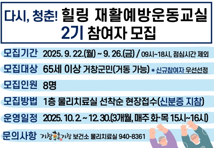 [뉴스스텝] 거창군은 10월 2일부터 12월 30일까지 운영되는'다시, 청춘 힐링 재활예방운동교실 2기'참여자 8명을 오는 9월 22일부터 26일까지 5일간 모집한다.