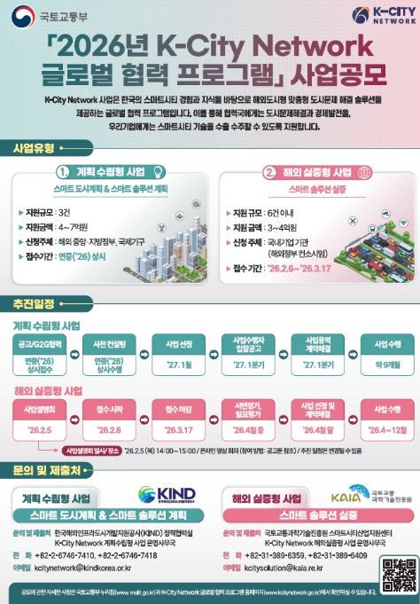 국토교통부 김연희 도시경제과장은 “K-City Network 글로벌 협력사업은 해외 도시와 함께 스마트도시를 기획하고 현장에서 실증까지 이어지는 대표적인 글로벌 협력 플랫폼”이라며, “2026년에는 AI 융합 스마트 솔루션의 해외 적용을 확대해 우리기업의 지속가능한 해외수출과 글로벌 경쟁력 강화를 적극 지원하겠다”고 밝혔다.