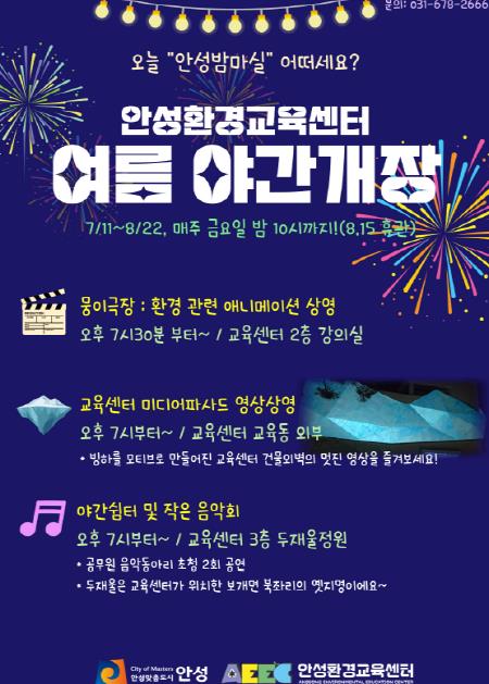 김보라 안성시장은 “이번 야간 개장은 신야간경제 활성화 프로젝트의 일환으로 더위로 지친 시민들이 편하게 환경교육센터를 이용하고 환경교육에 많은 관심을 가짐으로 환경보전과 지역경제 활성화에도 기여할 수 있기를 희망한다”고 전하며 시민들의 많은 관심과 참여를 전했다.
