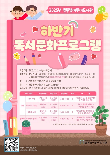 [뉴스스텝] (재)인천광역시계양구인재양성교육재단 별똥별어린이도서관(관장 한양진)은 지역주민을 대상으로 ‘2025년 하반기 독서문화 프로그램’을 운영한다고 밝혔다.