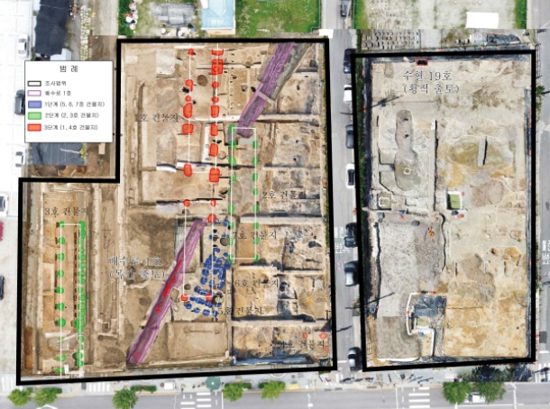 | ▲ 부여 관북리유적 발굴지 전경(악기출토 : 수혈19호, 목간출토 : 배수로1호와 수혈19호) |