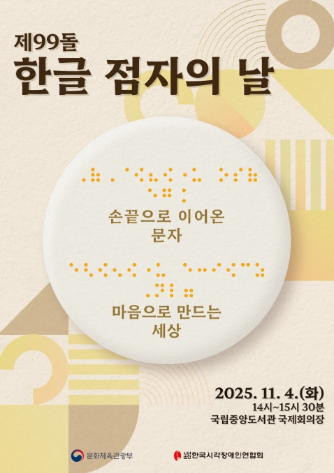 [뉴스스텝] 문화체육관광부는 한국시각장애인연합회와 함께 11월 4일 오후 2시, 국립중앙도서관에서 ‘제99돌 한글 점자의 날’ 기념식을 개최한다.