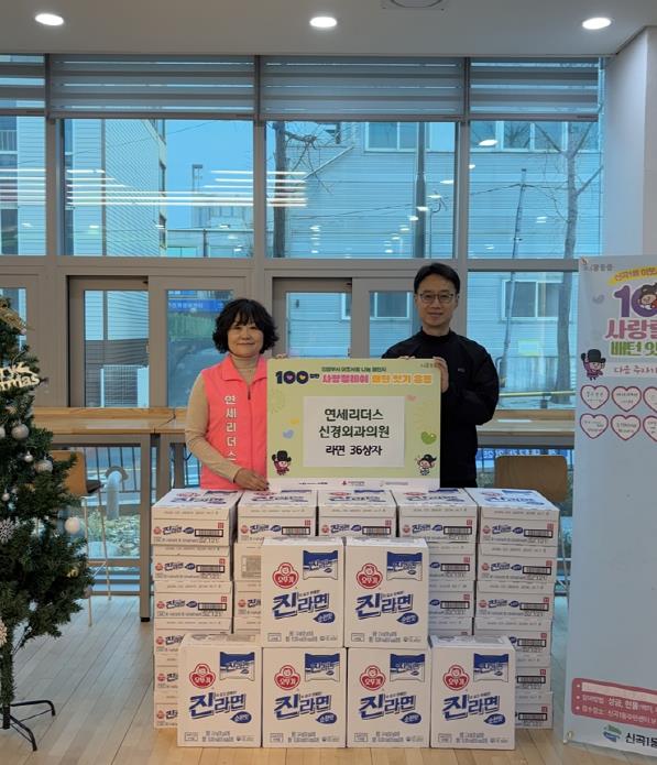 [뉴스스텝] 의정부시 신곡1동주민센터는 11월 27일 연세리더스신경외과의원이 저소득 취약계층을 돕기 위해 라면 36상자를 기탁하며 ‘100일간 사랑릴레이 배턴 잇기’에 동참했다고 밝혔다.
