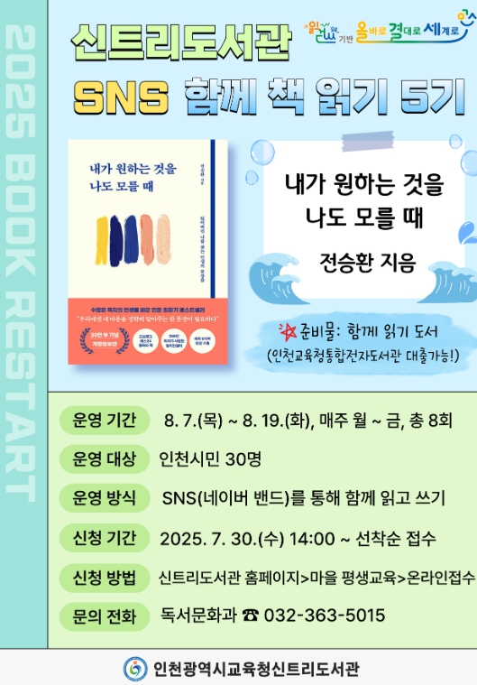 [뉴스스텝] 인천광역시교육청신트리도서관은 시민들이 쉽고 편리하게 ‘읽걷쓰’를 실천할 수 있도록 ‘SNS 함께 책 읽기 5기’ 참여자를 모집한다.