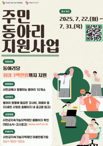 보다 자세한 사항은 서천군지속가능지역재단 홈페이지 고시-공고에서 확인 가능하며, 신청은 7월 31일까지 방문 접수하면 된다.