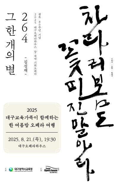 [뉴스스텝] 대구시교육청이 광복 80주년을 맞아 8월 21일 오후 7시 30분, 대구오페라하우스에서 대구교육가족을 위한 특별공연‘오페라 '264, 그 한 개의 별'’을 마련했다.