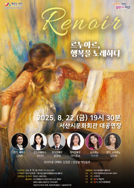 이완섭 서산시장은‘이번 공연은 르누아르의 회화처럼 따뜻하고 아름다운 무대를 통해 시민들에게 잔잔한 감동과 치유의 시간을 선사할 것’이라며 ‘많은 시민들이 함께 행복을 노래하는 공연에 참여하시길 바란다’고 전했다.