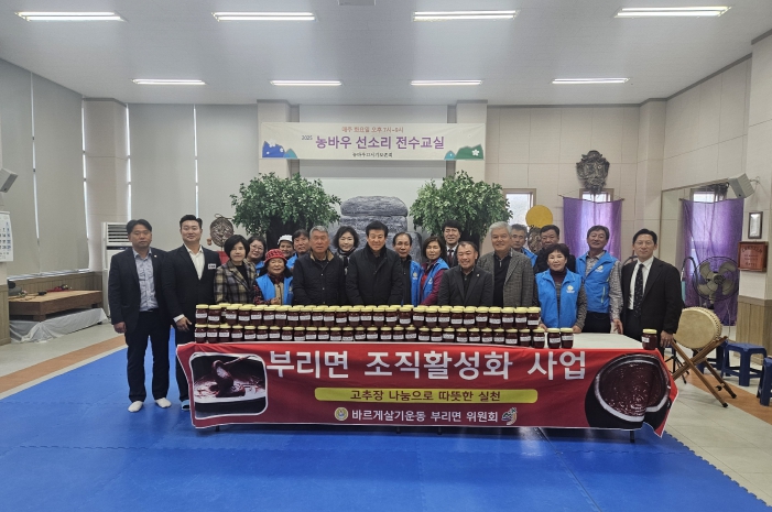[뉴스스텝] 금산군 부리면바르게살기운동위원회(위원장 양원식)는 지난 27일 평촌리 농바우끄시기전수관에서 회원 30여 명이 참여한 가운데 지역 내 소외계층을 위한 이웃사랑 고추장 담그기 봉사를 진행했다.
