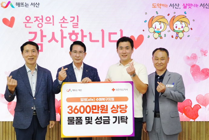 서산시는 8월 8일 서산시청에서 기탁식을 개최하고, 알레로부터 총 3,600만 원 상당의 성금 및 물품을 전달 받았다고 밝혔다.