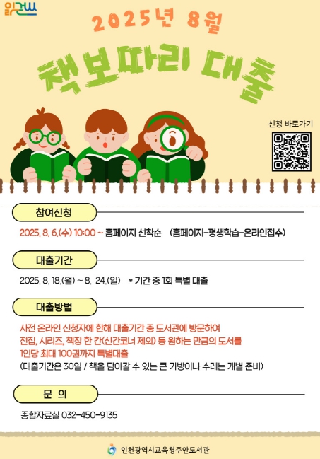 [뉴스스텝] 인천광역시교육청주안도서관은 오는 8월 6일 오전 10시부터 ‘책보따리 대출’ 프로그램 참여자를 모집한다.