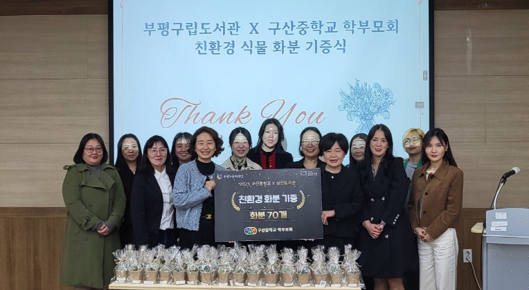 | ▲ 부평구립 삼산도서관, 구산중학교 학부모회로부터 친환경 식물 화분 기증받아 |