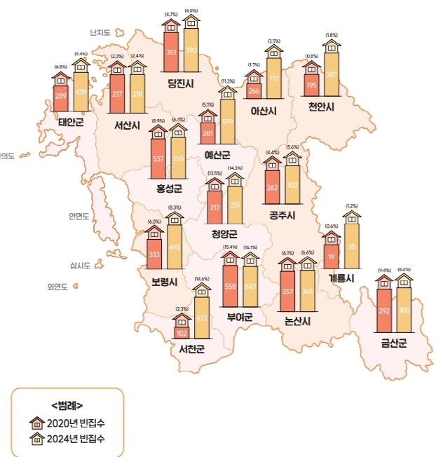 보고서에 따르면, 2024년 기준 아산의 빈집수가 717채로 가장 많았고, 다음으로 서천 672채, 예산 599채 등의 순으로 나타났다. 전체주택 대비 빈집 비율은 부여가 16.1%, 다음으로 서천 14.6%, 청양 14.3% 등의 순이었다.