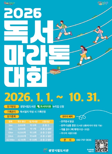 [뉴스스텝] 광양시립도서관이 지역사회에 독서문화 확산을 위해 2026년 1월 1일부터 10월 31일까지 ‘2026 광양시 독서마라톤 대회’를 운영한다.