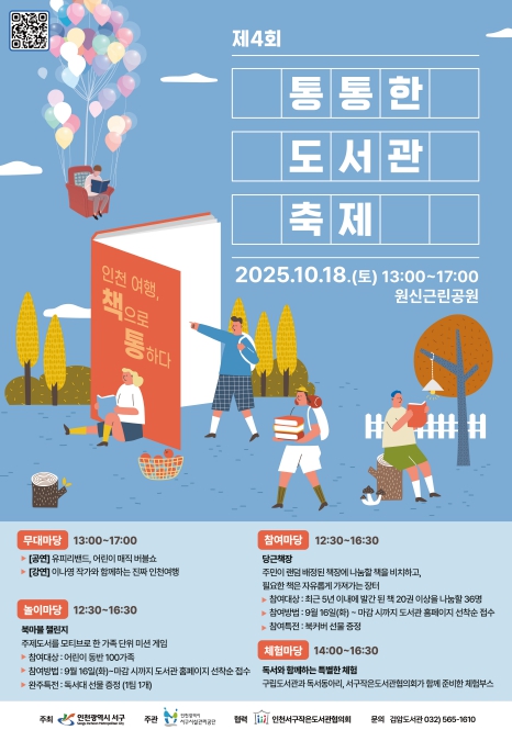 [뉴스스텝] 인천 서구 구립도서관(검암·단봉늘봄·검단·심곡·석남·신석 도서관)이 오는 18일 원신근린공원에서 ‘제4회 통통한 도서관 축제’를 개최한다.