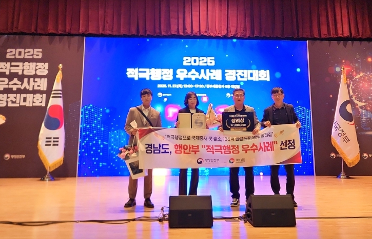 [뉴스스텝] 경남도가 지난 27일 열린 행정안전부 ‘2025년 적극행정 우수사례 경진대회’에서 ‘적극행정으로 국제중재 첫 승소, 138억 절감 도민에게 돌려줘’ 사례로 기관 표창(인사혁신처장상)을 받았다고 28일 밝혔다.