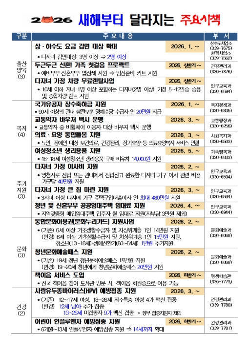 최기문 영천시장은 “2026년 달라지는 시책들이 시민분들의 일상에 실질적인 도움이 되길 바란다”며, “앞으로도 시민이 일상에서 체감할 수 있는 변화가 이어지도록 생활밀착형 정책을 지속적으로 개선해 나가겠다”고 말했다.