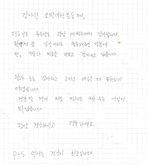 김원형 구급대원은 “당연히 해야 할 일을 했을 뿐인데 이렇게 감사 인사를 받아 오히려 부끄럽다”며 “A씨가 건강을 회복하고 퇴원하셨다는 소식을 들으니 뿌듯하다”고 말했다.