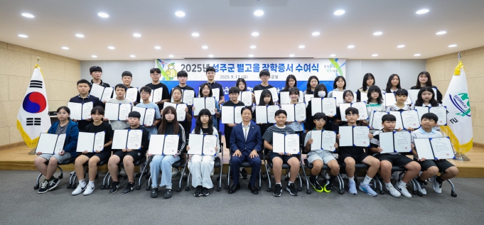 우수한 학업 성취를 이룬 학생들을 격려하고 지원하기 위해 지난 9월 12일 군청 문화강좌실에서 '2025년 성주군 별고을 장학증서 수여식'을 개최했으며, 이날 선발된 학생 가운데 각 학교를 대표하는 37명의 학생이 행사에 참석하여 영예로운 순간을 함께했다.