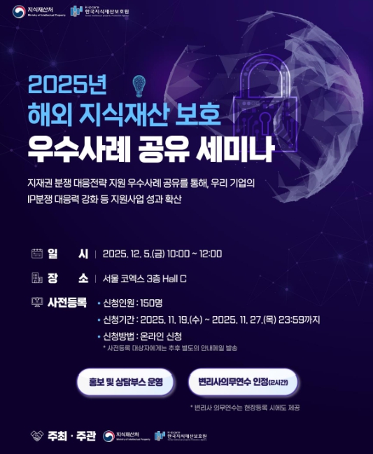 [뉴스스텝] 지식재산처는 12월 5일 10시 코엑스(서울시 강남구)에서 ‘2025년 해외 지식재산 보호 우수사례 공유 세미나’를 개최한다. 이번 행사는 2025 대한민국 지식재산대전의 일부 행사로 진행되며, 우리 기업이 해외 시장에서 자주 마주하는 지식재산 분쟁에 효과적으로 대응할 수 있게 실제 우수 사례와 대응 전략을 공유하는 자리로 마련됐다.