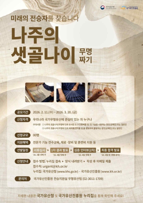 [뉴스스텝] 국가유산청은 국가유산청 산하 국가유산진흥원과2월 11일부터 3월 20일까지 단절 위기의 국가긴급보호무형유산인 '나주의 샛골나이(무명짜기)'의 미래 전승자 발굴을 위한 공모를 진행한다.