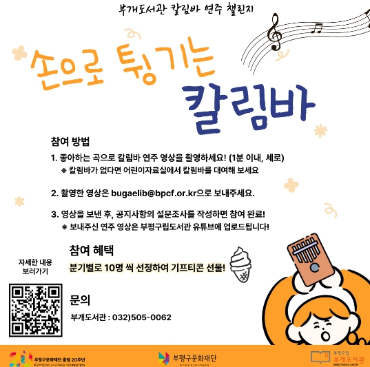 이 프로그램은 누구나 쉽게 연주할 수 있는 악기 칼림바(손가락 피아노)를 활용한 참여형 음악 프로그램으로, 참여자는 간단한 연주 영상을 촬영해 응모할 수 있다. 접수된 영상은 부평구립도서관 온라인 영상 채널에 게시되며, 추첨을 통해 참여자에게 소정의 사은품이 제공된다.