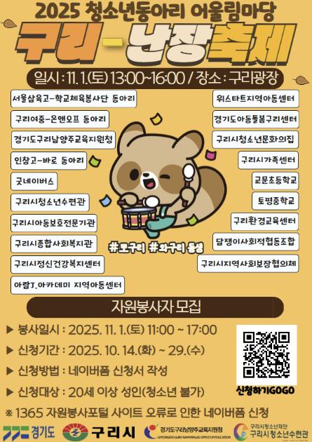 [뉴스스텝] 구리시청소년재단 청소년수련관은 오는 11월 1일 오후 1시부터 4시까지 구리광장에서‘2025 청소년동아리 어울림마당(구리-난장 축제)’을 개최한다. 이번 축제는 구리 지역 아동 청소년 네트워크 공동사업으로 추진되며, 청소년과 시민이 함께 즐길 수 있는 다양한 체험과 공연 프로그램이 마련되어 있다.