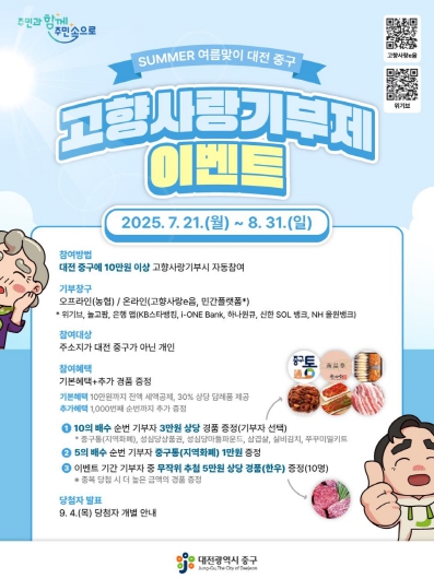 [뉴스스텝] 대전 중구는 오는 8월 31일까지 ‘고향사랑기부제’ 참여자를 대상으로 여름맞이 특별 이벤트를 진행한다고 21일 밝혔다.