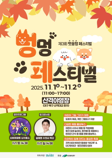 [뉴스스텝] 올해로 3회째를 맞이하는 지역 최대 야외 반려동물 행사인 『2025 멍멍 페스티벌(제3회 펫 동행 페스티벌)』이 11월 1일부터 11월 2일까지 산격야영장(산격대교 하단 둔치 일원)에서 개최된다.