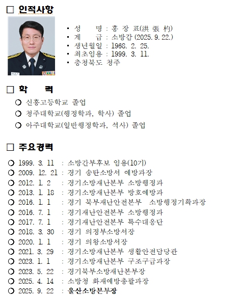 ▲ 홍장표 신임 울산소방본부장 프로필 |