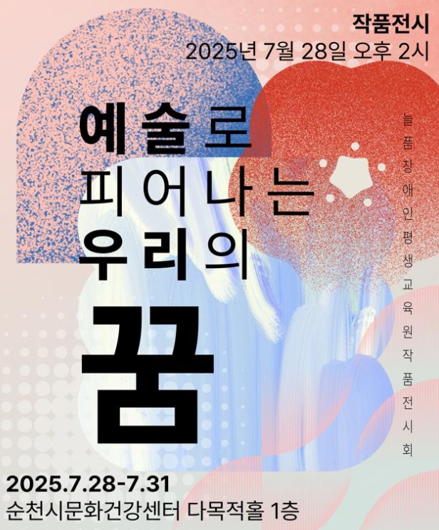 [뉴스스텝] 순천시는 늘픔장애인평생교육원이 오는 28일부터 31일까지 순천시문화건강센터에서 “예술로 피어나는 꿈”을 주제로 장애인 작품 전시회를 개최한다고 밝혔다.