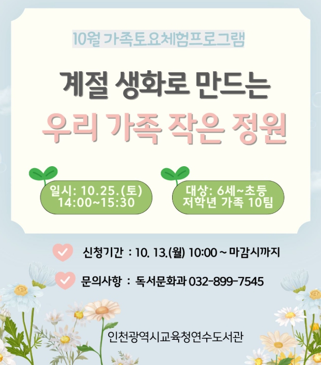 [뉴스스텝] 인천광역시교육청연수도서관은 오는 10월 25일 오후 2시 평생학습1실에서 가족 이용자를 위한 ‘10월 가족 토요체험 프로그램’을 운영한다.