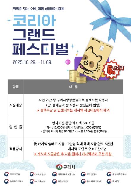 [뉴스스텝] 구리시는 오는 10월 29일부터 11월 9일까지 열리는 ‘2025 코리아 그랜드 페스티벌’ 기간 동안 구리사랑상품권 5% 추가 적립금 사업을 추진한다고 밝혔다.