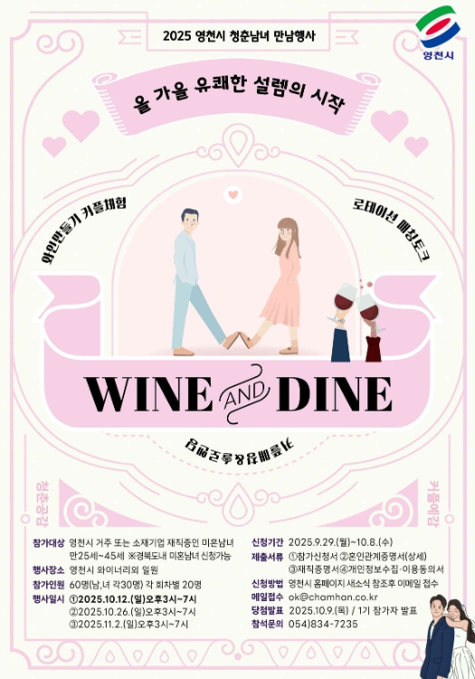 [뉴스스텝] 영천시는 오는 10월 12일, 10월 26일, 11월 2일 세 차례에 걸쳐 관내 와이너리에서 미혼남녀를 위한 특별한 만남 프로그램 ‘2025 영천愛 와인·다인(wine·dine)’을 개최한다.