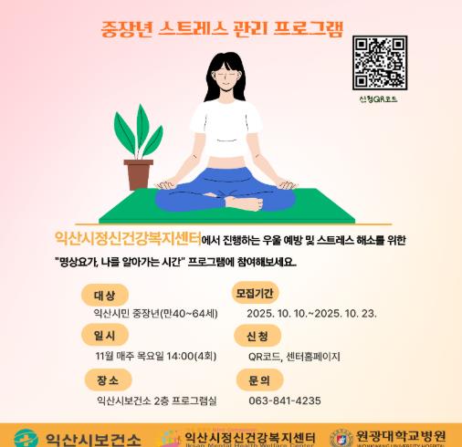 [뉴스스텝] 익산시정신건강복지센터는 만 40~64세 중장년을 대상으로 '마음힐링 명상요가' 프로그램을 운영한다고 10일 밝혔다.