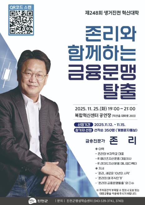 [뉴스스텝] 충북 진천군은 오는 11월 25일 충북혁신도시 복합혁신센터 공연장에서 금융 교육의 대가인 금융전문가 존 리를 초청해 제248회 생거진천 혁신대학 강좌를 개최한다고 11일 밝혔다.