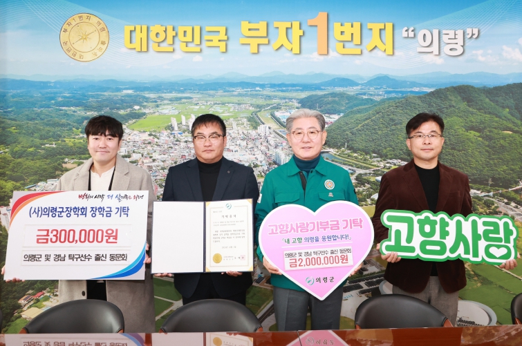 [뉴스스텝] 의령군은 지난 1일 의령군과 경남 지역 탁구선수 출신들로 구성된 동문회가 고향사랑기부금과 (사)의령군장학회 후원금으로 총 230만원을 기탁했다고 밝혔다.