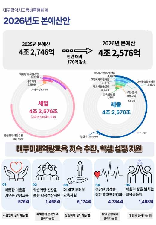 [뉴스스텝] 대구시교육청은 2026년도 대구광역시교육비특별회계 예산안을 올해 예산보다 170억 원 감액된 4조 2,576억 원으로 편성해 10월 27일 대구시의회에 제출했다고 밝혔다.