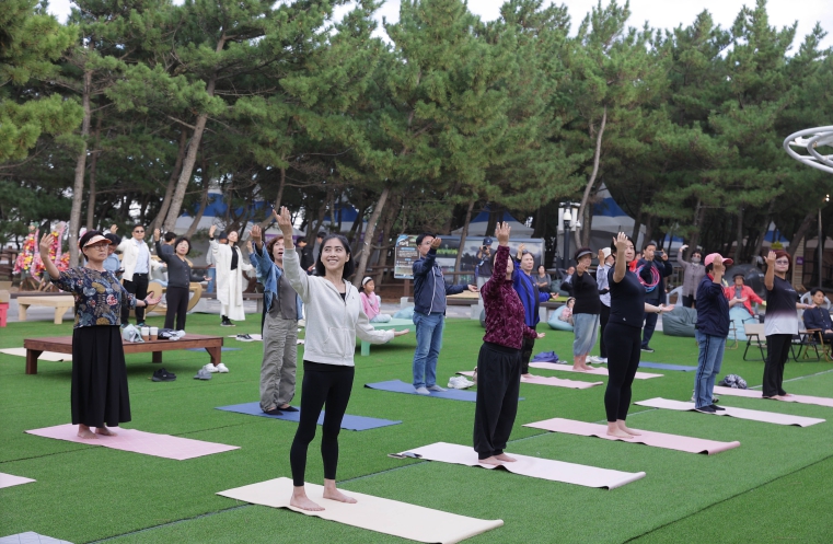 | ▲ 2024년도 영덕국제H웰니스페스타 현장에서 방문객들이 요가 체험을 하고 있다. |