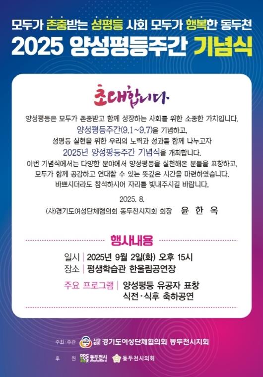 [뉴스스텝] 동두천시는 양성평등주간(9월 1일~7일)을 맞아 오는 9월 2일 오후 3시 평생학습관 한울림공연장에서 2025년 양성평등주간 기념식을 개최한다고 밝혔다.