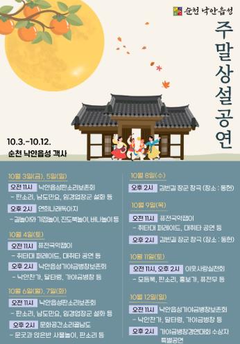 [뉴스스텝] 순천시는 순천 낙안읍성에서 '주말 상설공연'과 '김빈길 장군 창극' 공연을 오는 10월 3일부터 12일까지 선보인다고 밝혔다.