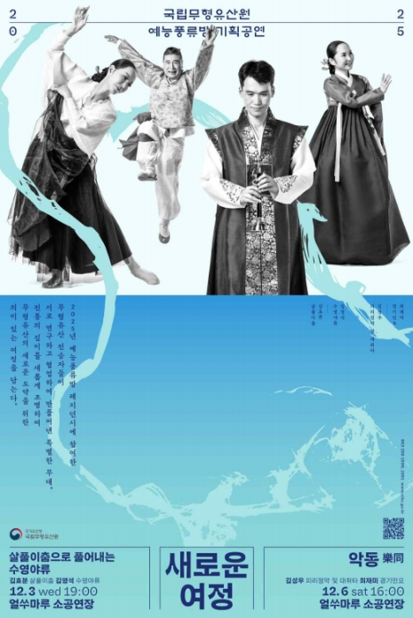 [뉴스스텝] 국가유산청 국립무형유산원은 12월 3일과 12월 6일, 국립무형유산원 얼쑤마루 소공연장(전북 전주시)에서 ‘예능풍류방’ 참여 무형유산 전승자들의 성과발표 협업공연 '새로운 여정'을 개최한다.