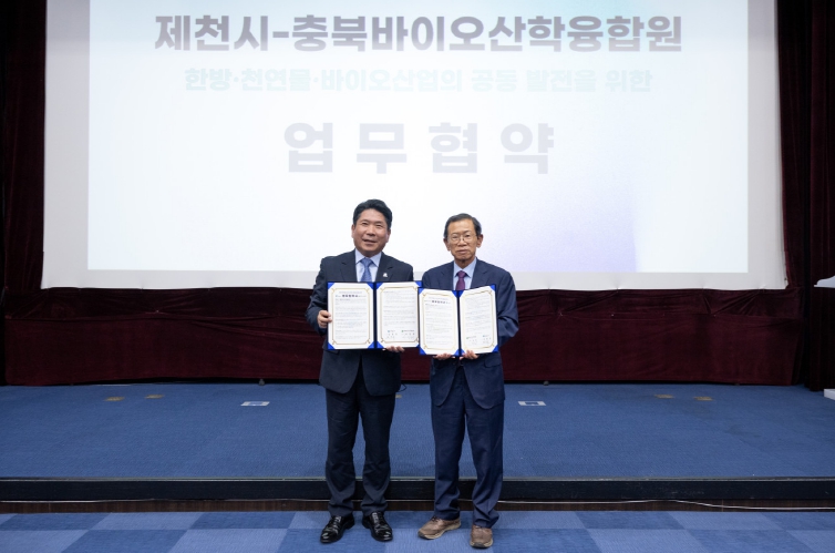 [뉴스스텝] 제천시는 9월 30일 ‘2025 제천국제한방천연물산업엑스포’ 기간 중 한방생명과학관 다목적강당에서 충북바이오산학융합원과 한방·천연물산업 발전을 위한 업무협약(MOU)을 체결했다.